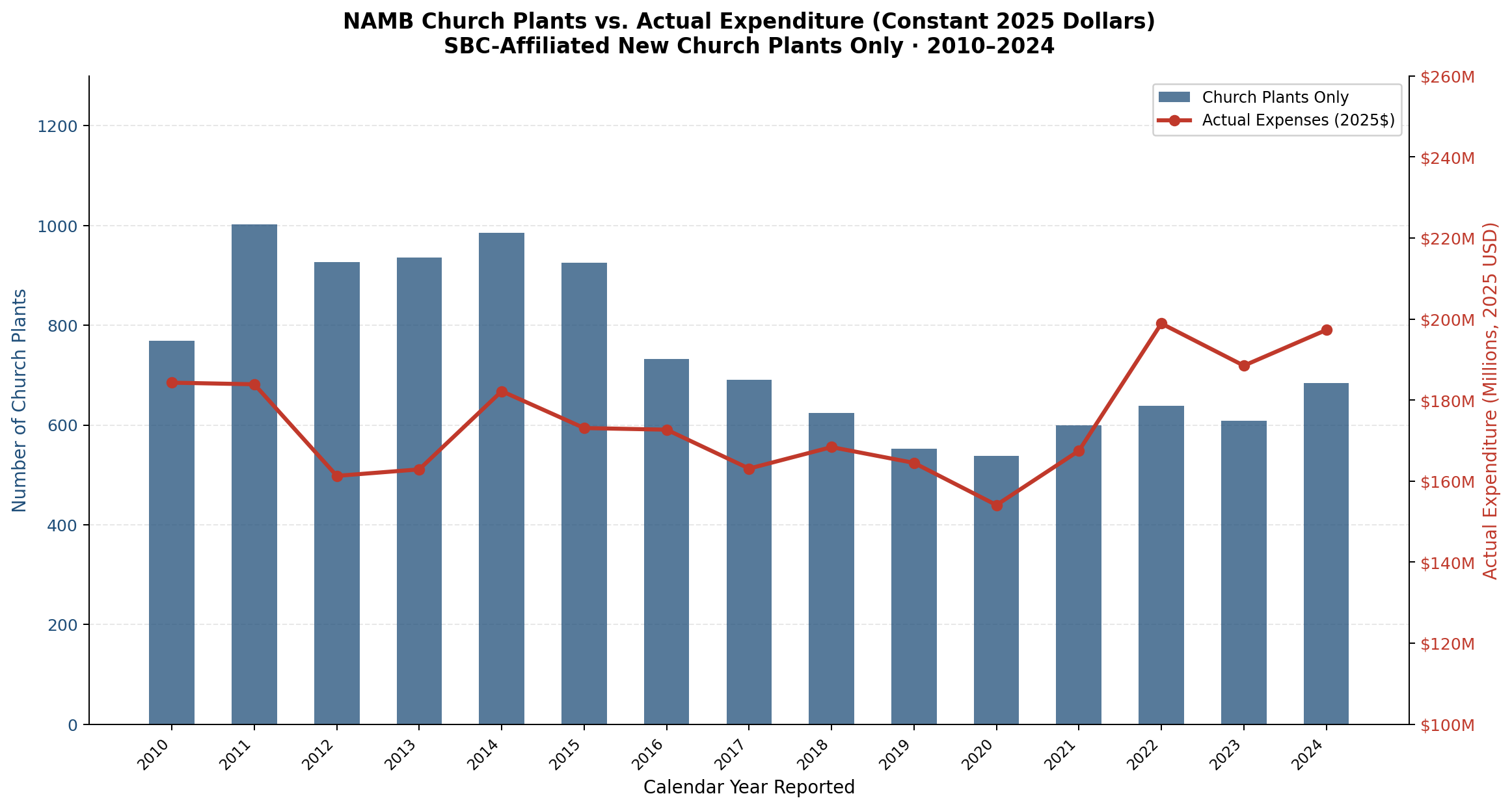 Bars (left axis): number of new church plants only (excluding campuses, replants, and existing churches that joined the SBC as affiliates). Line (right axis): NAMB total actual expenditure restated to constant 2025 dollars (CPI-U). 2021–2024 denotes years where audited totals include non-operating and investment activity. The 2020 figure revised from 588 to 538 per Scott Barkley (Baptist Press Article, Sept. 2025).
